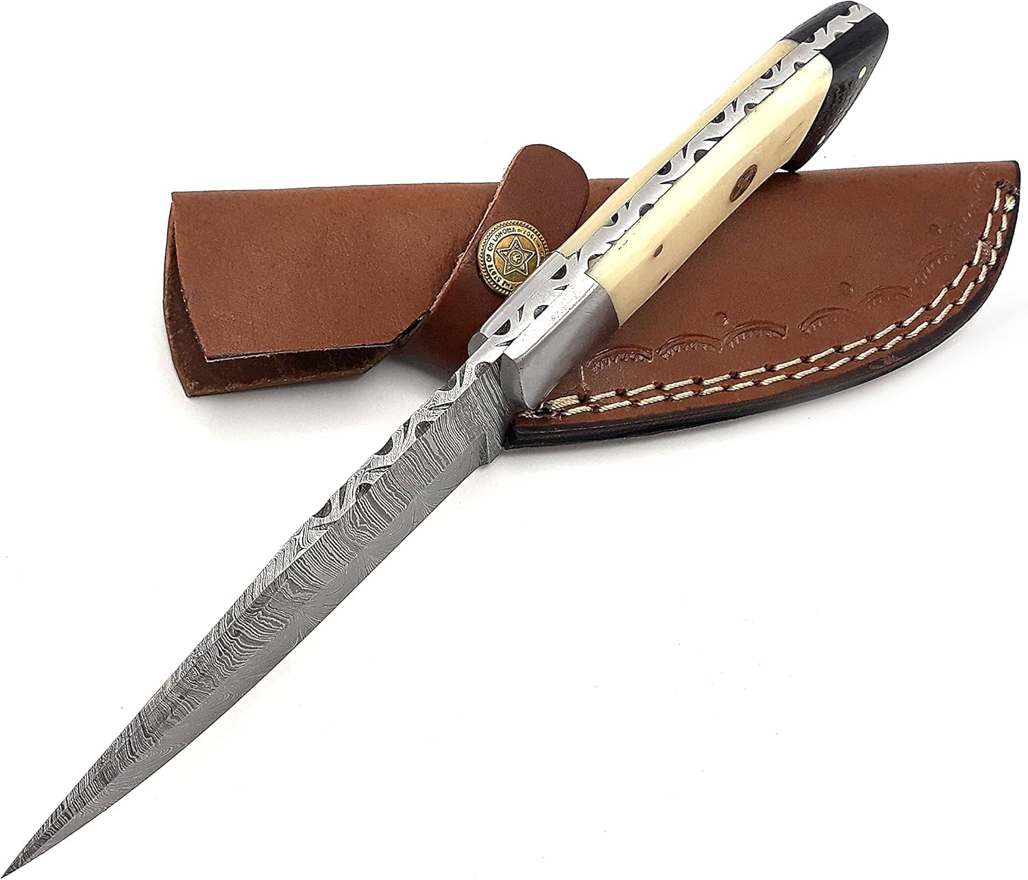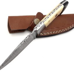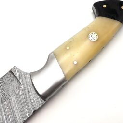 This isn’t your average factory-made knife. The soul of this blade lies in its Damascus steel, forged from layers of high and low carbon steel, folded time and again to create a blade that’s not only incredibly strong and sharp but also mesmerizingly beautiful. The unique wave-like pattern on the blade is a signature of its quality and a mark of true craftsmanship. From skinning game to crafting kindling, the fixed blade design offers unparalleled strength and reliability when you need it most.