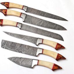 This high-grade Damascus Chef Knife Set is crafted from low and high-carbon steel (1095 & 15N20), folded and forged into 200 layers. With a 56-58 HRC hardness, these durable blades offer long-lasting sharpness. Made with quality materials, hand forged damascus knife set combines style and functionality. Care instructions are included with your purchase.