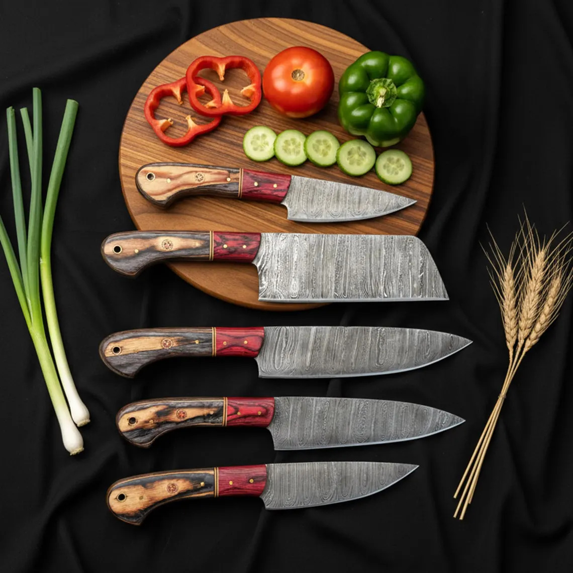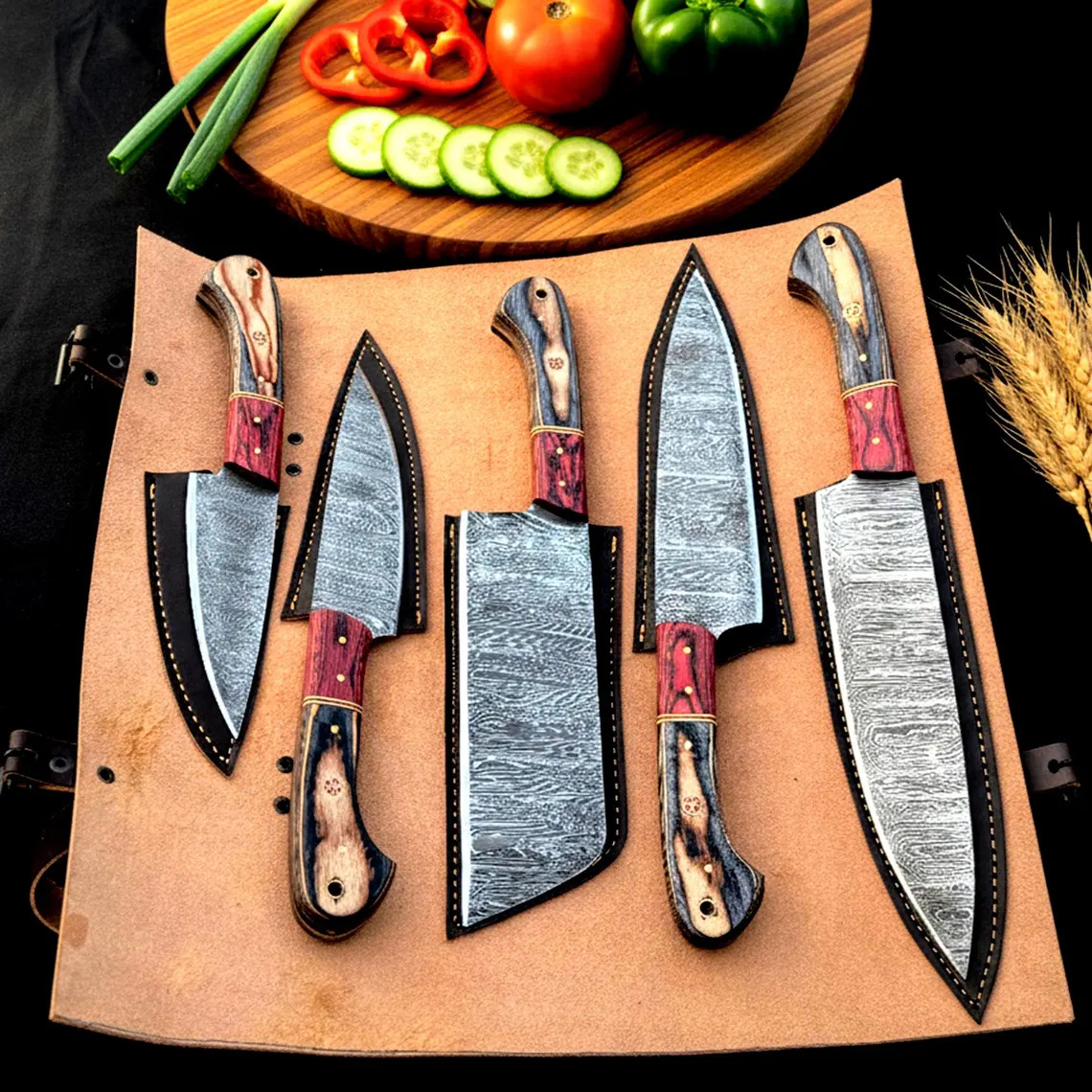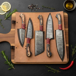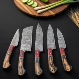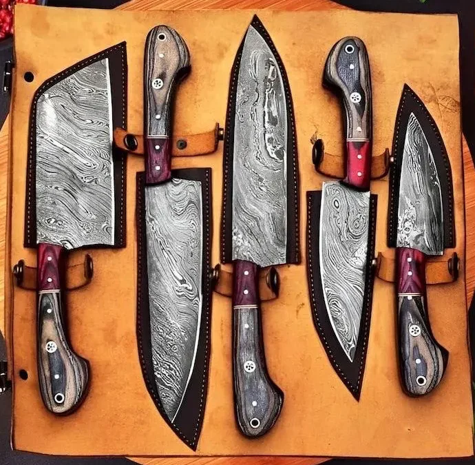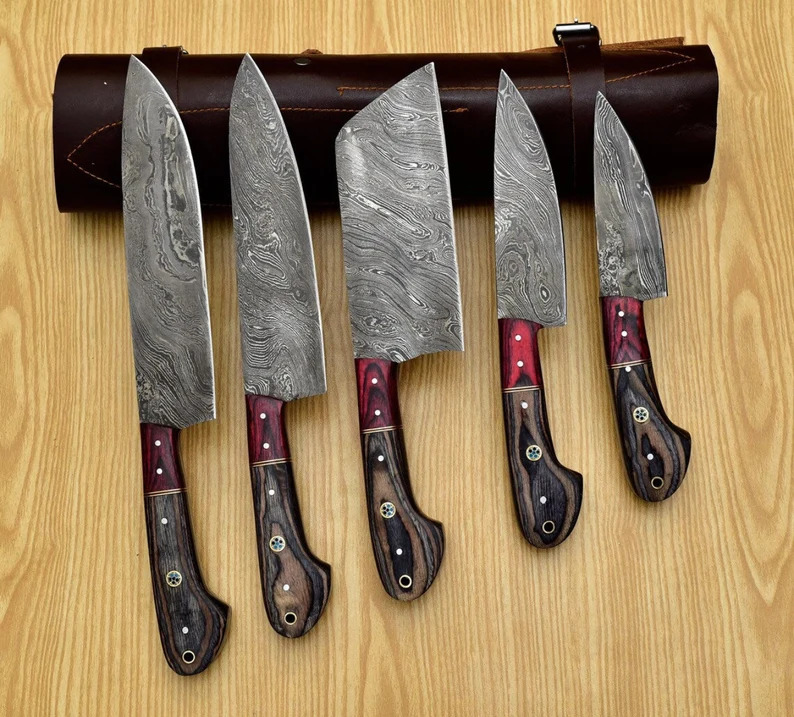This 5-piece Professional Utility Knife Set, including a Chopper/Cleaver and Pocket Case,damascus steel kitchen knife set is perfect for home chefs and culinary professionals. The hand-forged Damascus blades have 176 layers for superior sharpness and durability. Each knife has Rosewood or Olivewood handles and a handmade leather sheath.