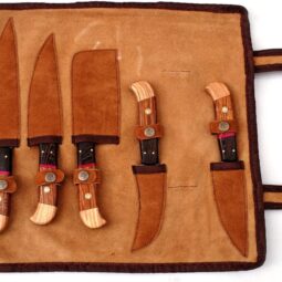 This Professional Kitchen Set is crafted from high-quality 1095 and 15N20 high carbon steels, forged into a billet, and folded multiple times to create unique patterns and a 55-60 HRC hardness. The result is a flexible, durable blade with invisible serrations for cutting. Each knife has a rosewood handle and a storage roll case bag. damascus chefs knife set5-piece set equips you for any cooking task.