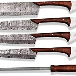 This exquisite Handmade Damascus Kitchen/BBQ Knife Set includes four knives, a sharpener, and a leather roll kit.damascus kitchen knife set Crafted with 176 layers of twisted Damascus steel and 55-58 HRC hardness, each knife offers superior strength and durability. The set features a 6-inch Cleaver, 7-inch Chef knife, 6-inch Paring knife, and 6-inch Steak knife, all with 5-inch Rosewood handles for a comfortable grip. Note: these knives are not full-tang and require cleaning after each use. Perfect for all your kitchen and BBQ needs!