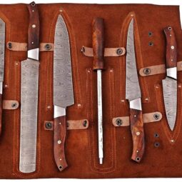 This kitchen set is the perfect addition to any chef’s professional collection. It contains 6 pieces, including 5 knives and one knife sharpener, all crafted with 176 layers of Damascus steel for strength and durability. The handles are crafted from natural rosewood, providing an ergonomic grip that’s comfortable to use. With a 55-58 HRC hardness, this set will stay sharp longer and perform better than ever before. Plus, damascus knife set comes with a convenient leather roll for easy storage and portability. No matter what you’re cooking up in the kitchen, this Damascus steel set has you covered!